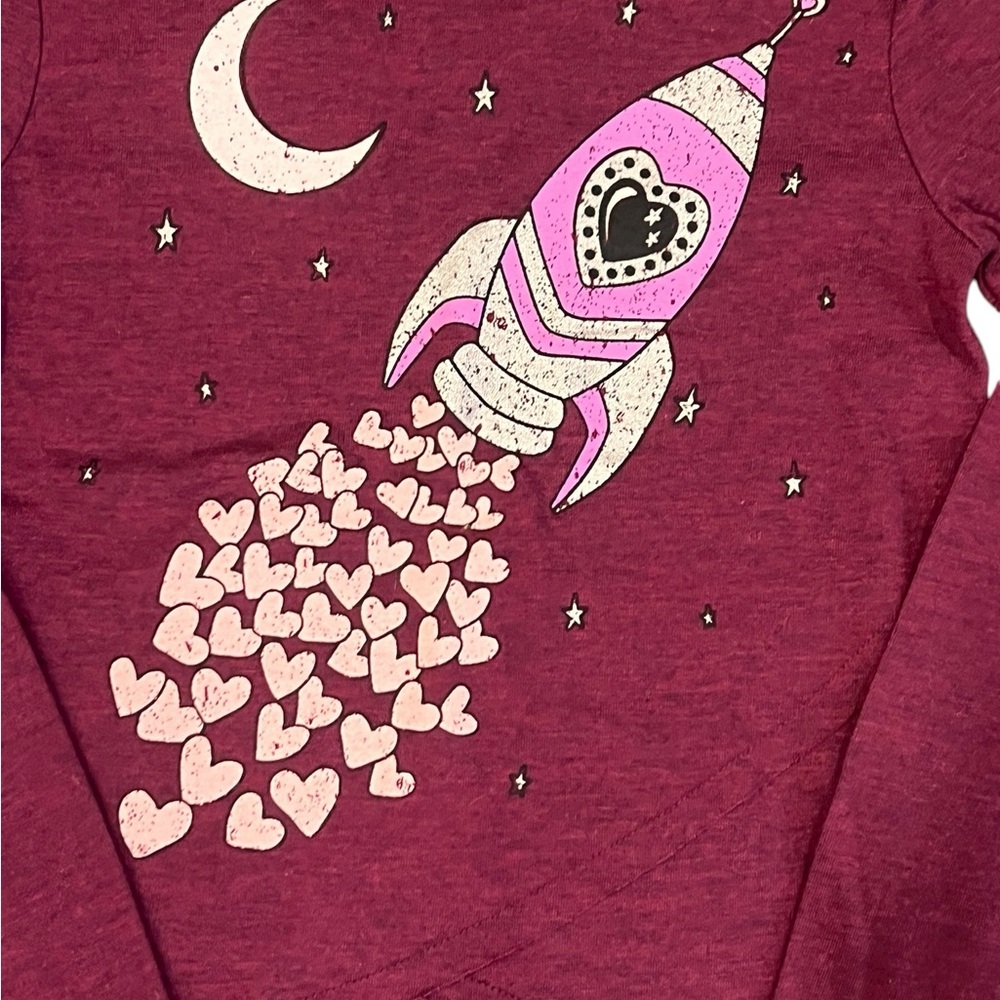 Charming long sleeve tee with a playful rocket and heart design