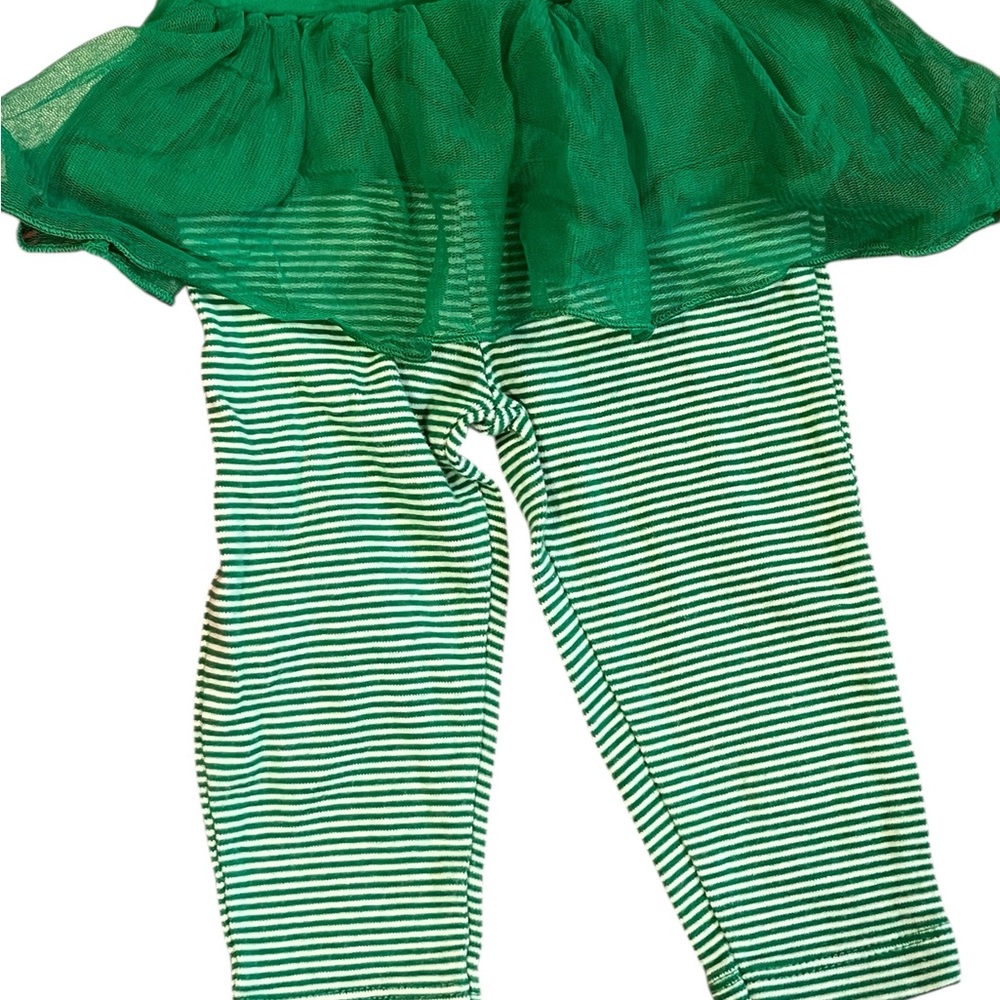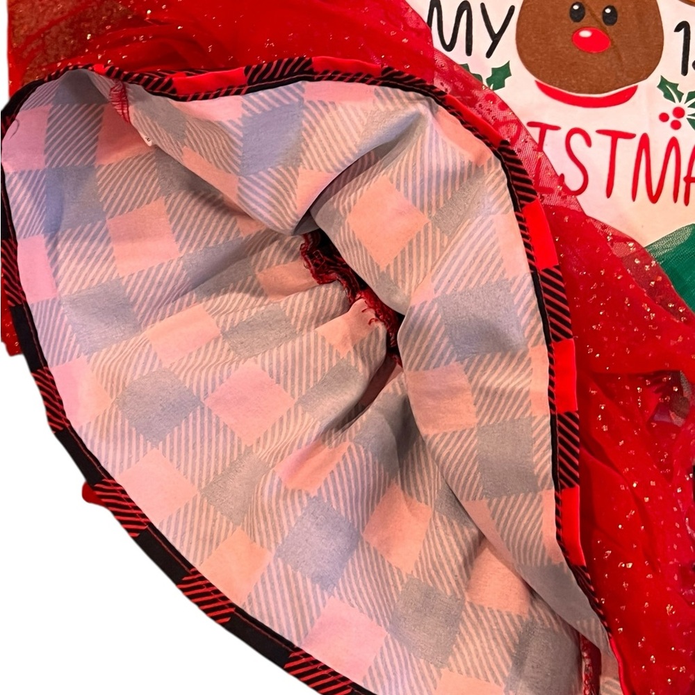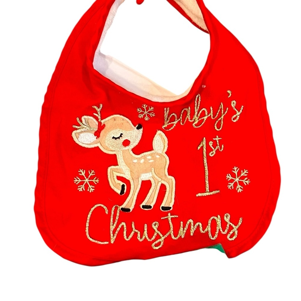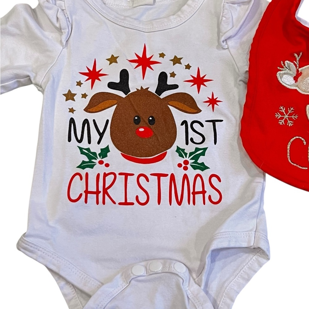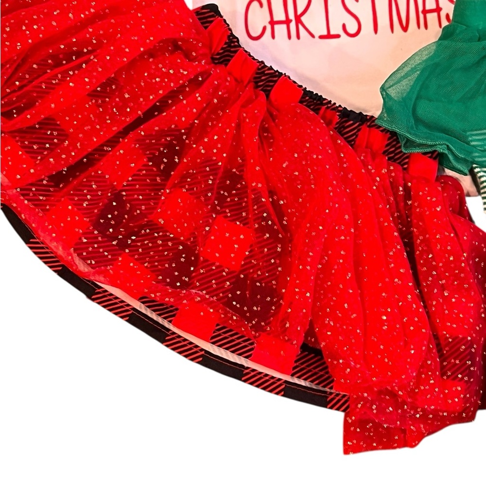 Adorable baby Christmas outfit set featuring a reindeer top, red tutu skirt, green striped leggings, and a red bib.