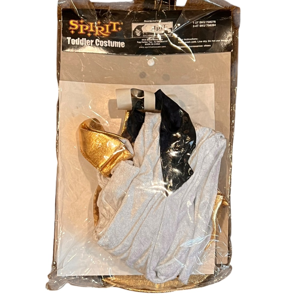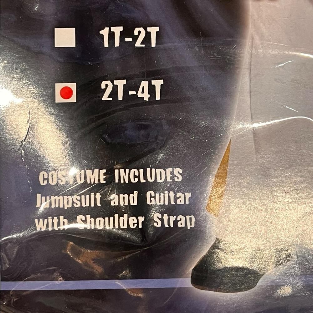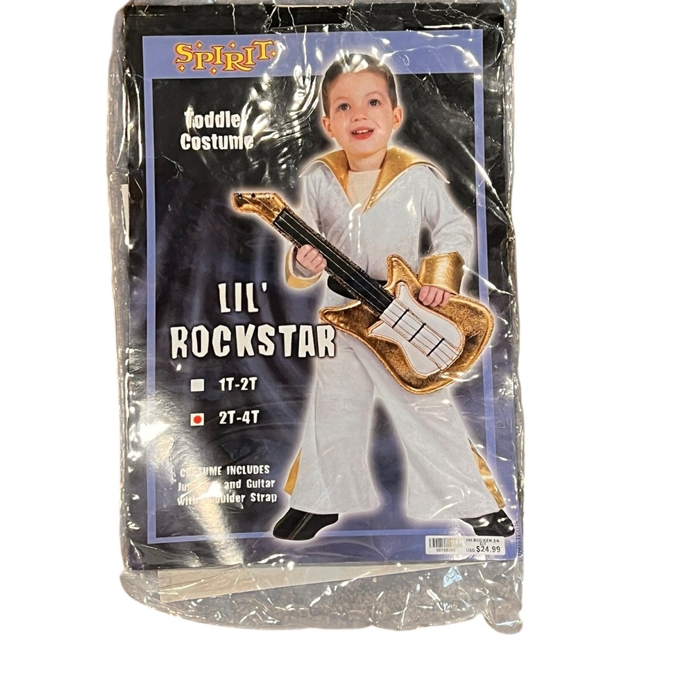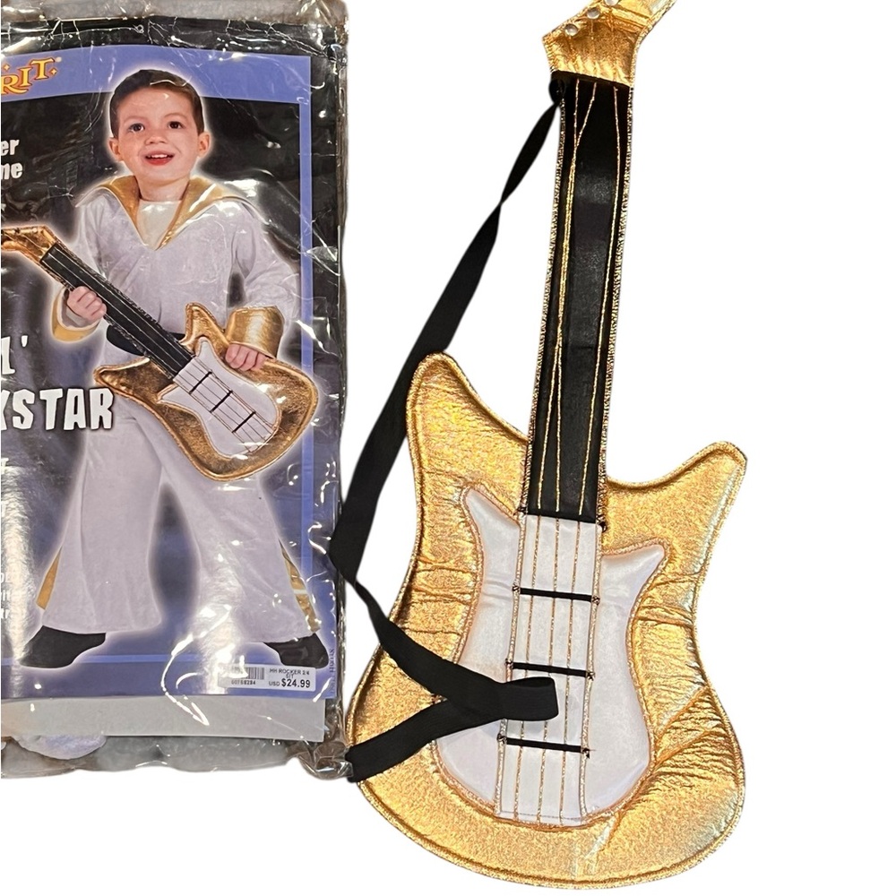 Gold and white rockstar costume featuring a shiny guitar with strap