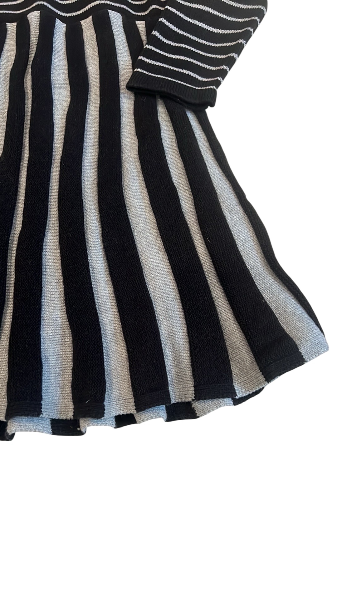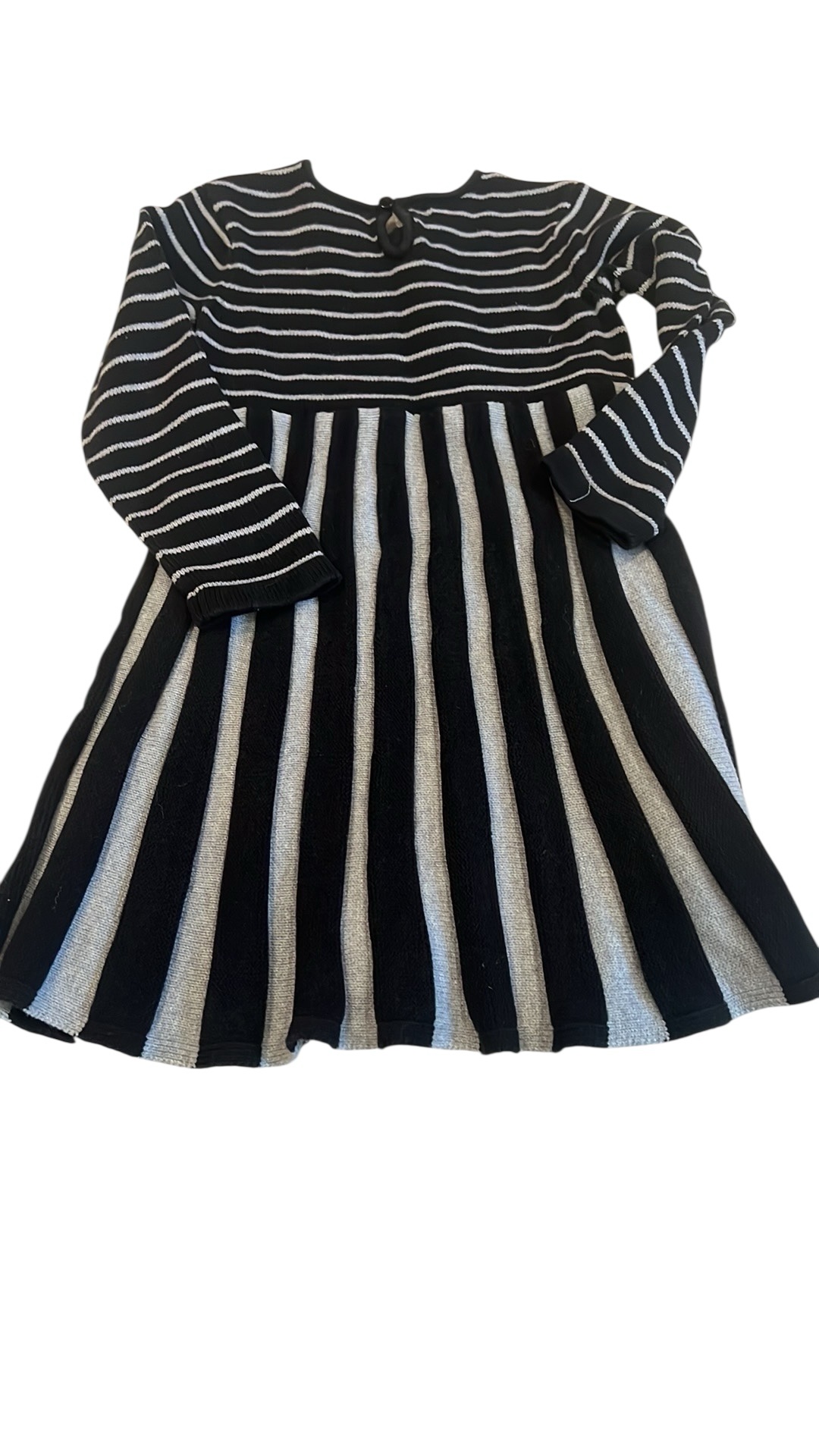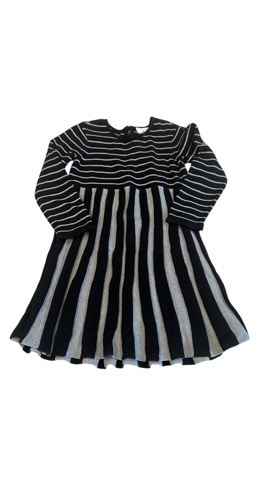 Like new, adorable sweater dress by Hanna Anderson. Grey and black. Pleated twirly skirt with back button. Size 110 (5-6)