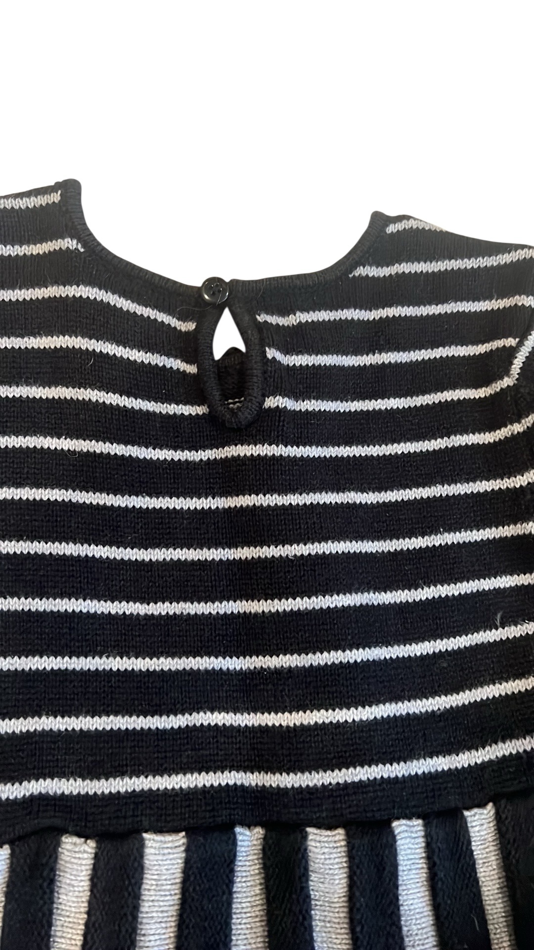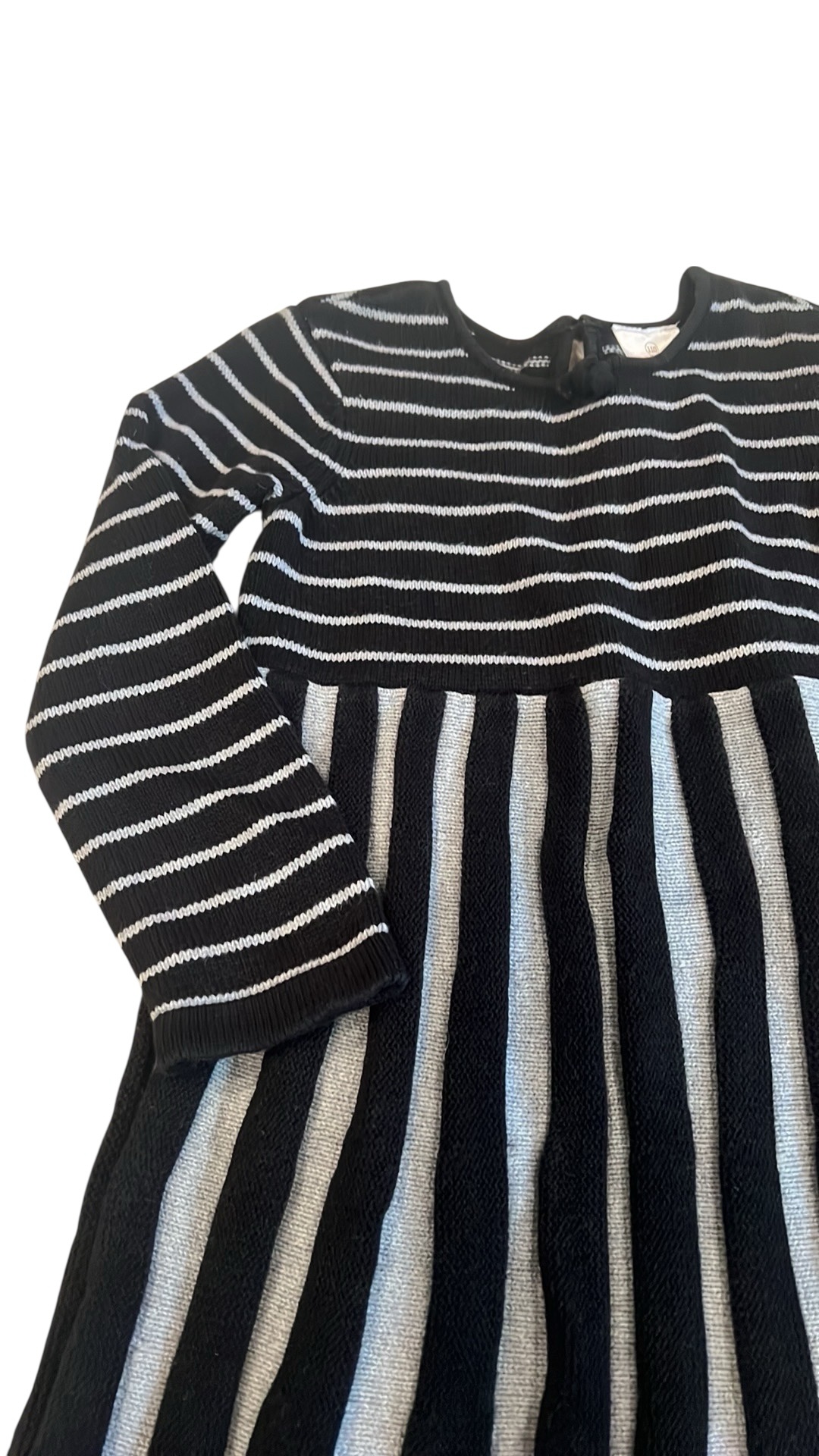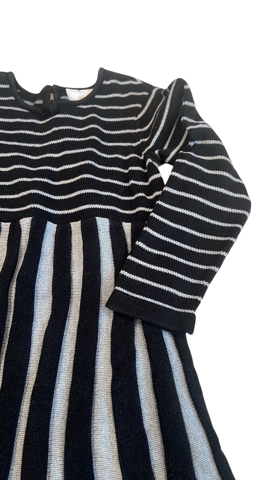 Like new, adorable sweater dress by Hanna Anderson. Grey and black. Pleated twirly skirt with back button. Size 110 (5-6)