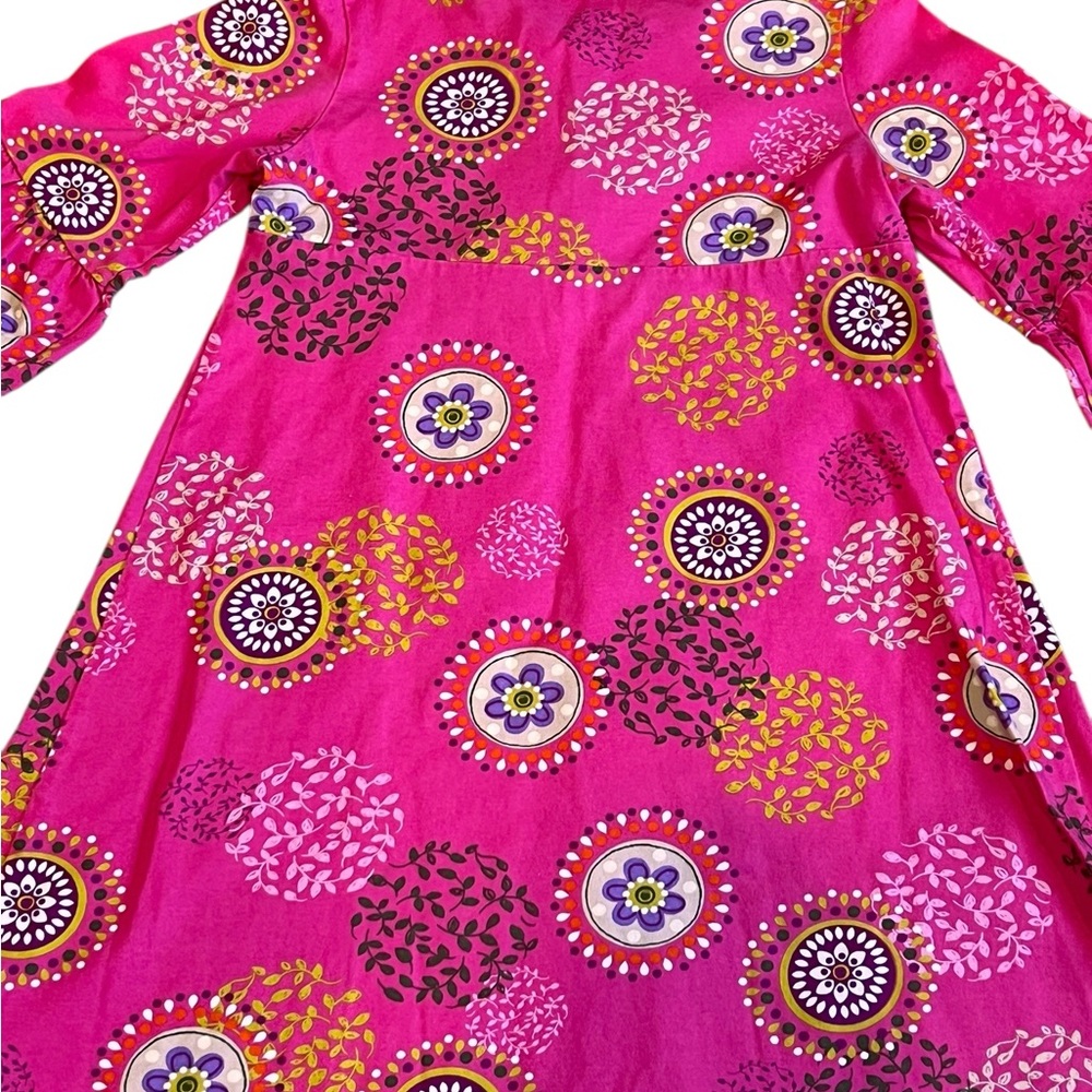Bright pink floral dress with 3/4 sleeve an large buttons on front