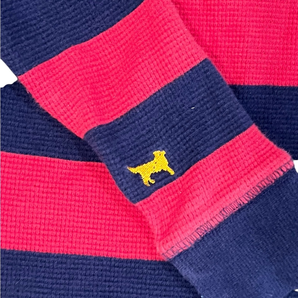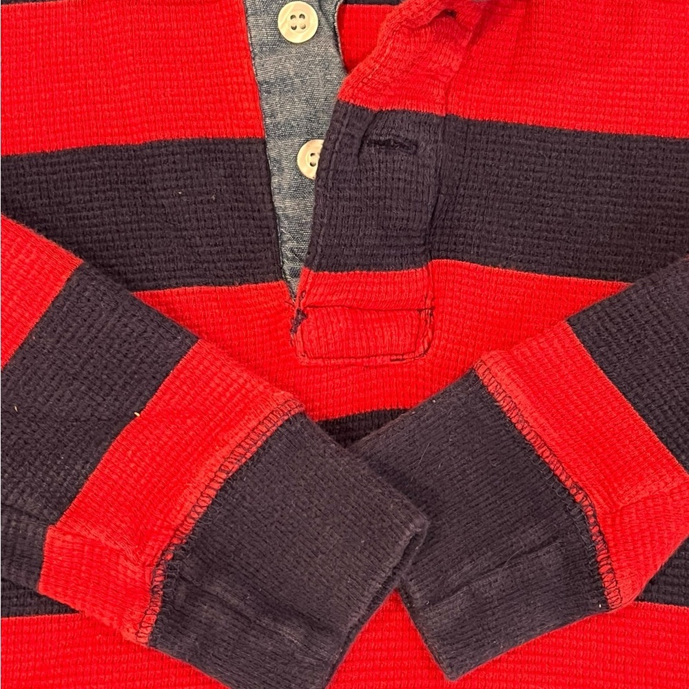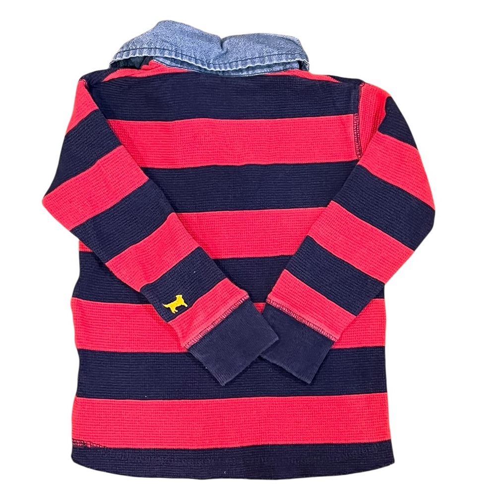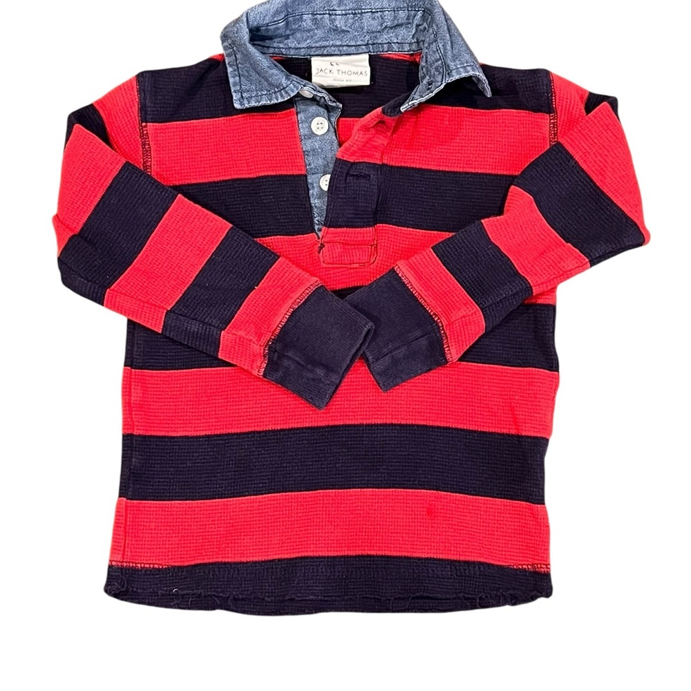 Navy and red striped waffle style polo with denim like collar