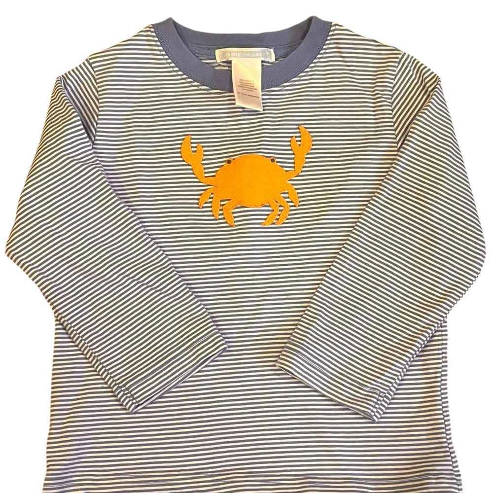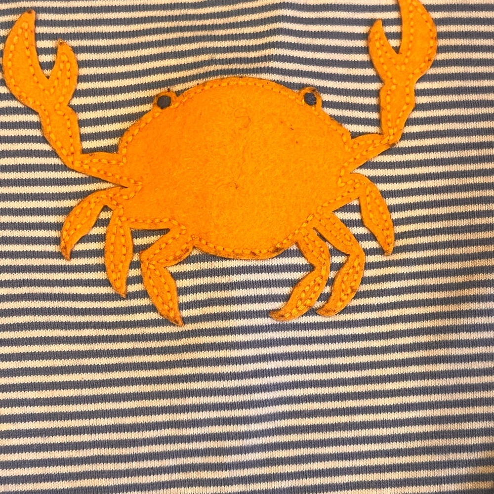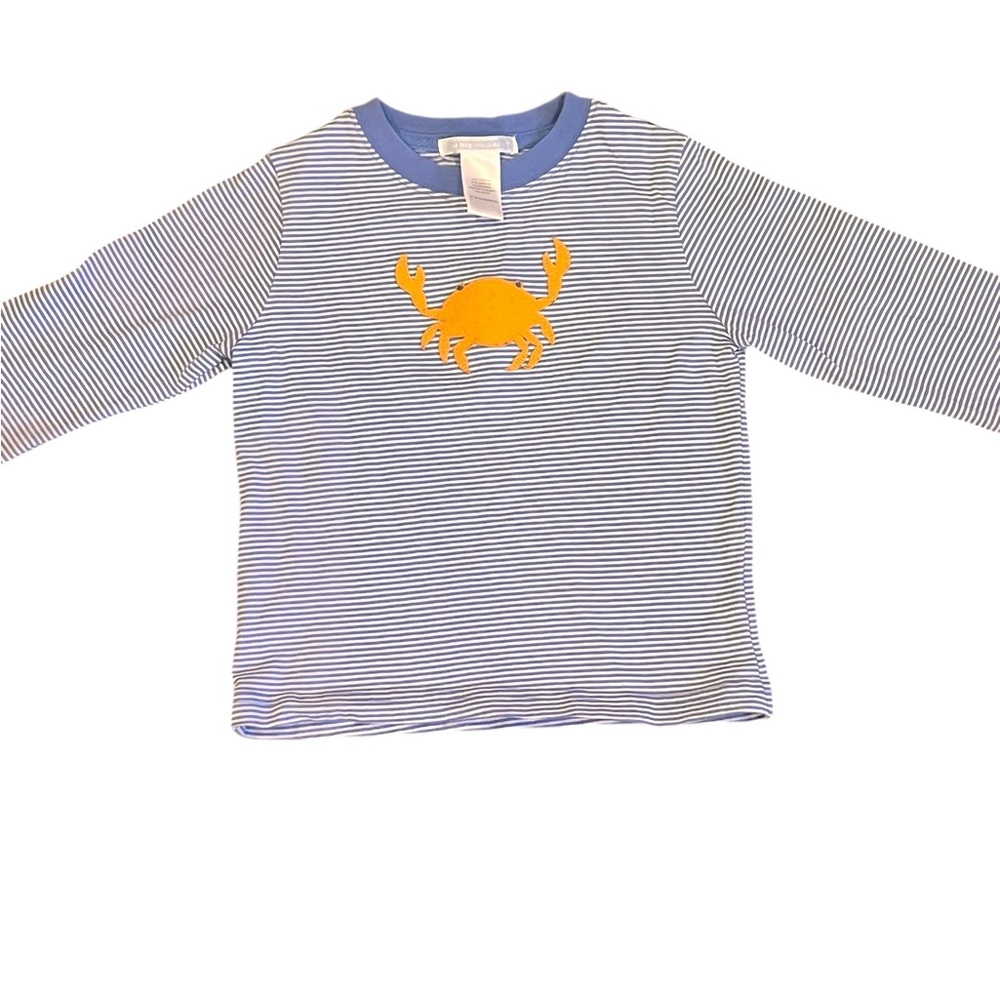 Long sleeve tee with playful orange crab on blue and white stripes