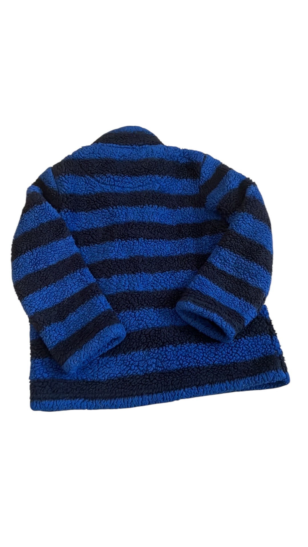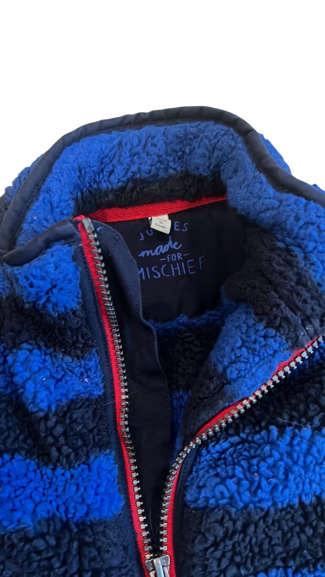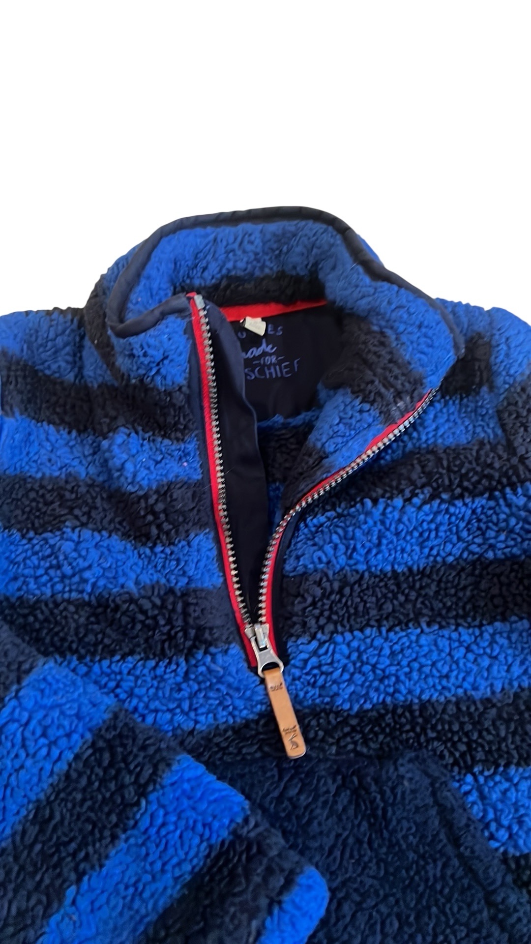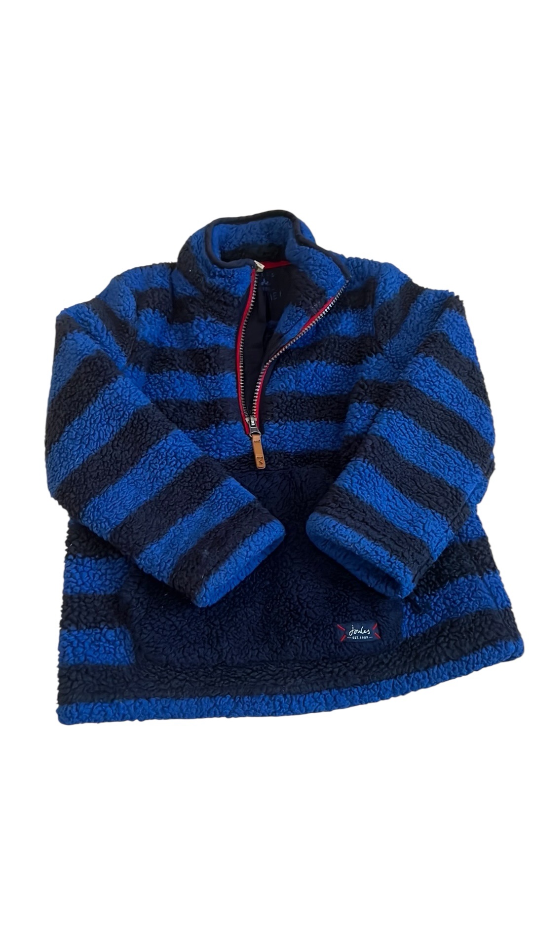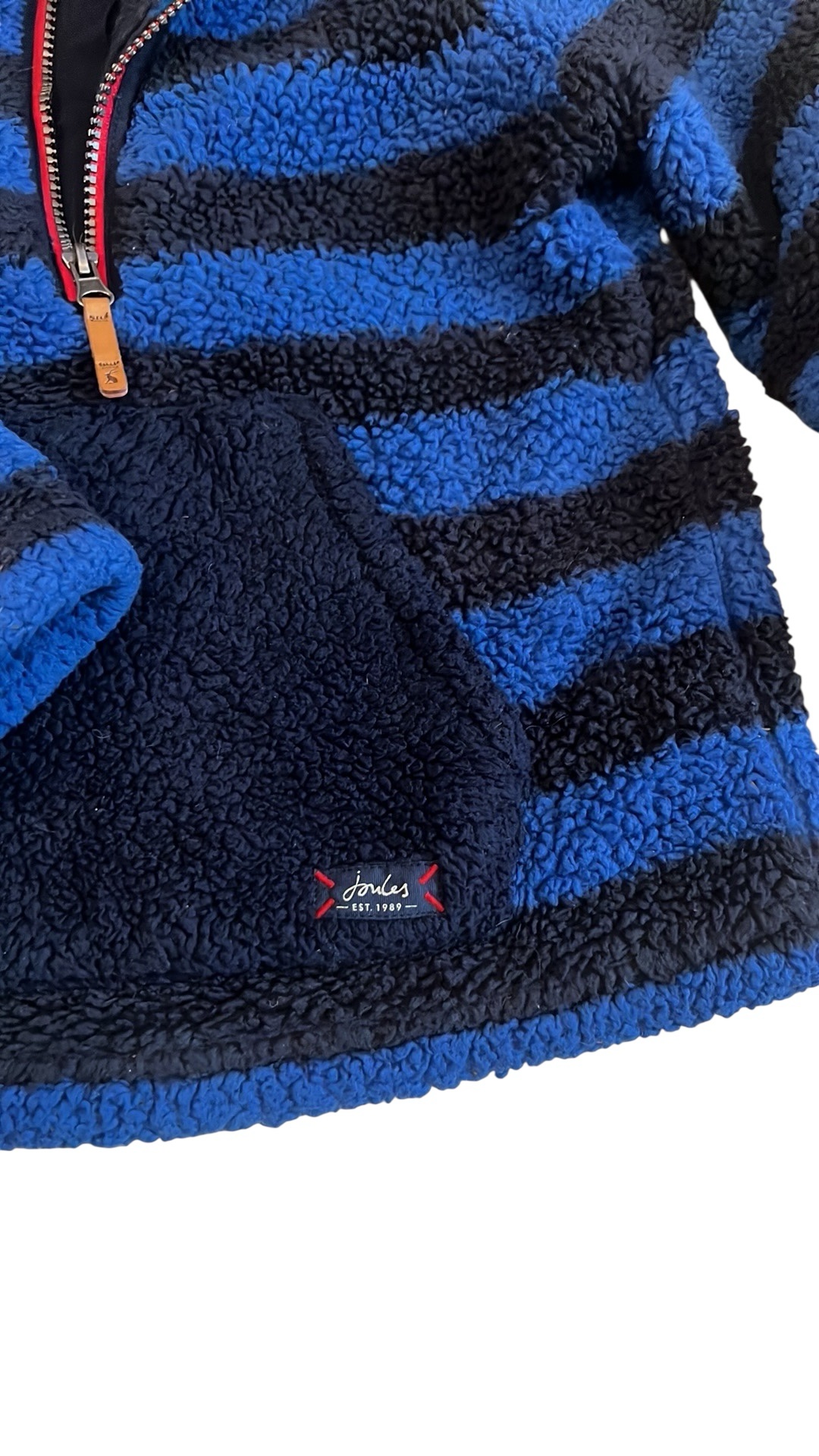 Blue and navy striped extra thick and soft pullover fleece by Joules. 3/4 zip, quarter collar, kangaroo front pocket. Size 6