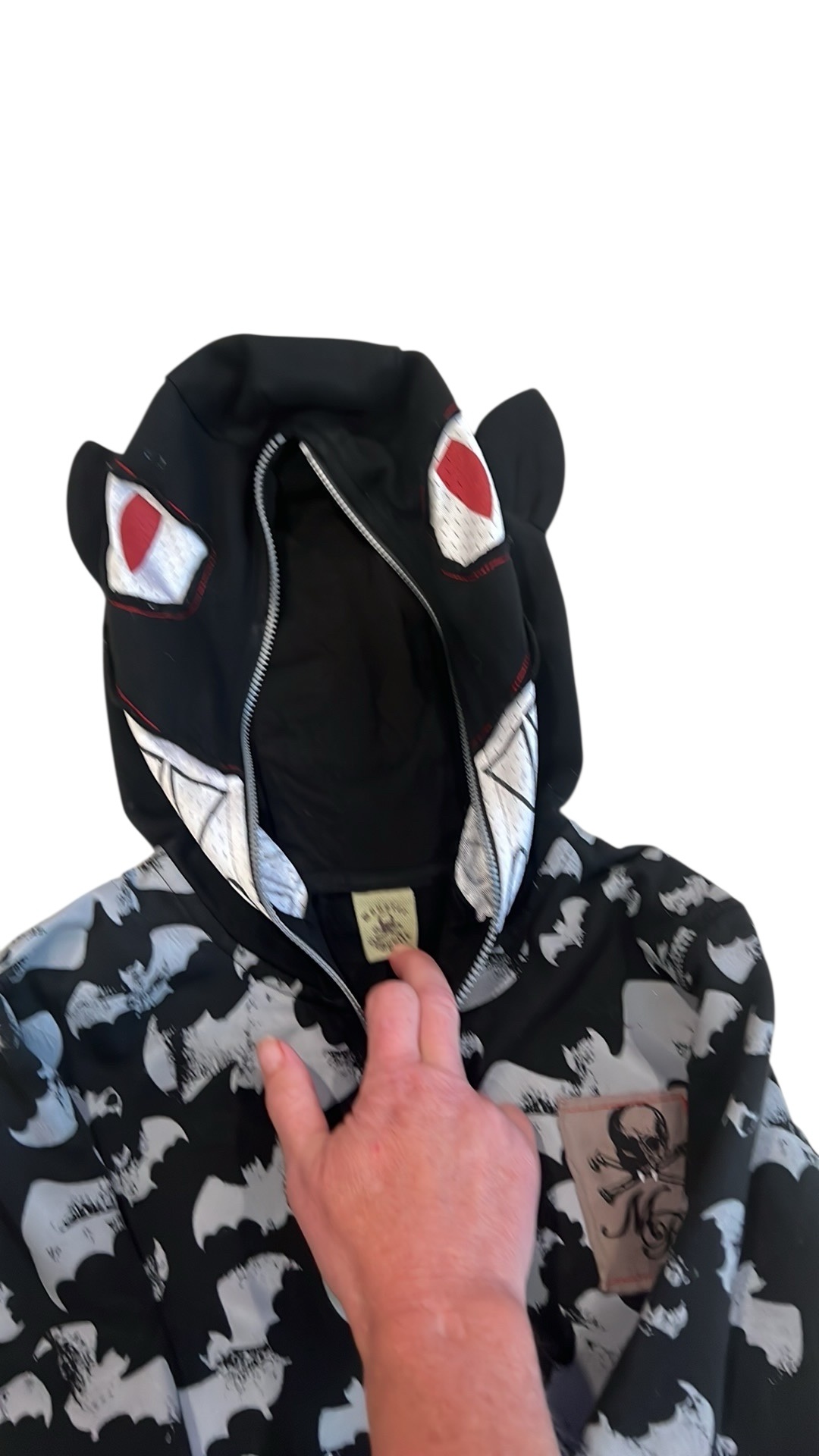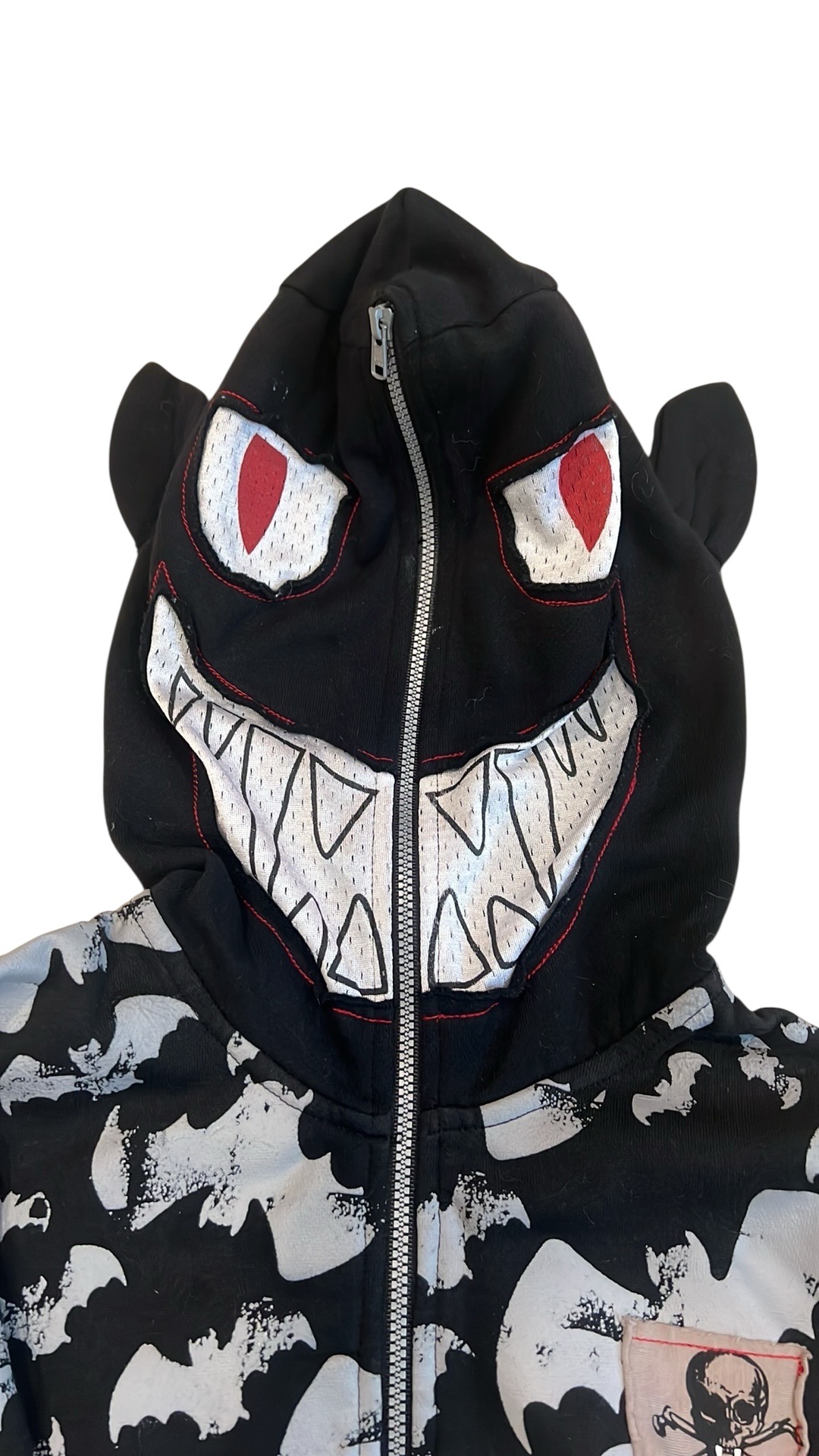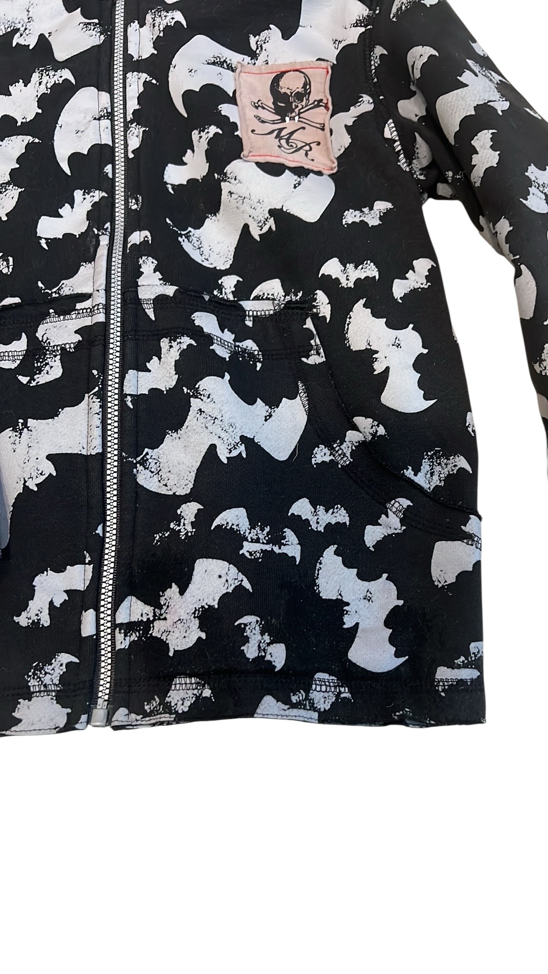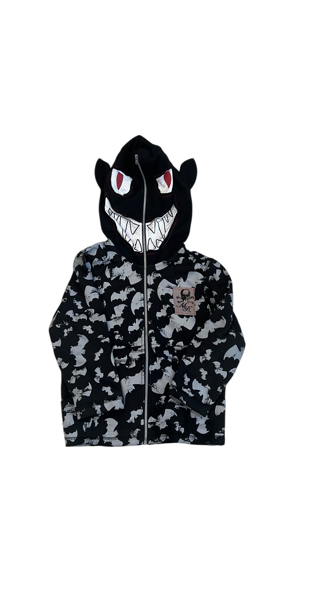 Like new, full zip hoodie. Black with grey bats. Zips all the way up to cover face, creating bat hoodie/mask, breathable mesh over mouth. Pockets. Monster Republic. Size 5