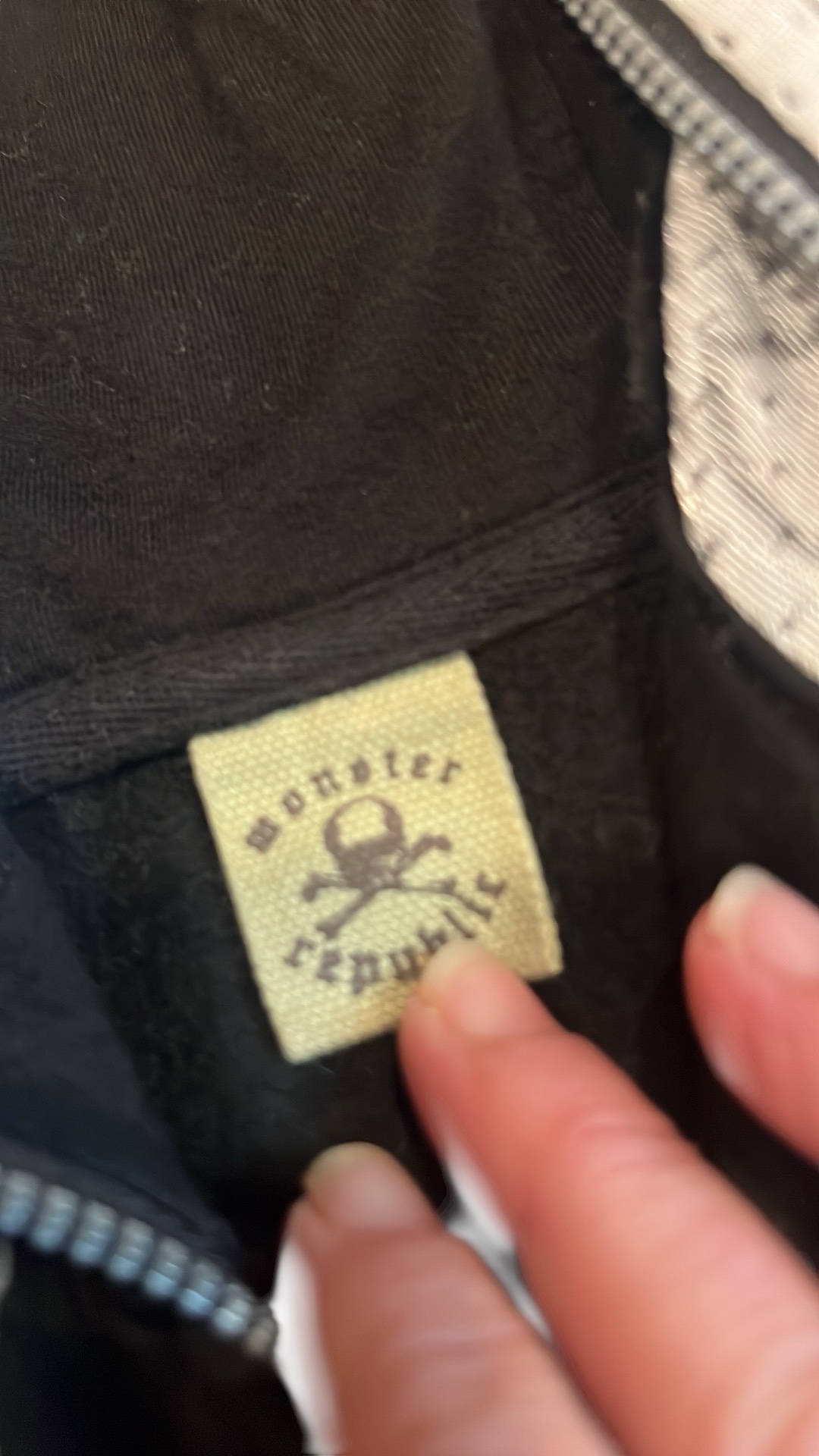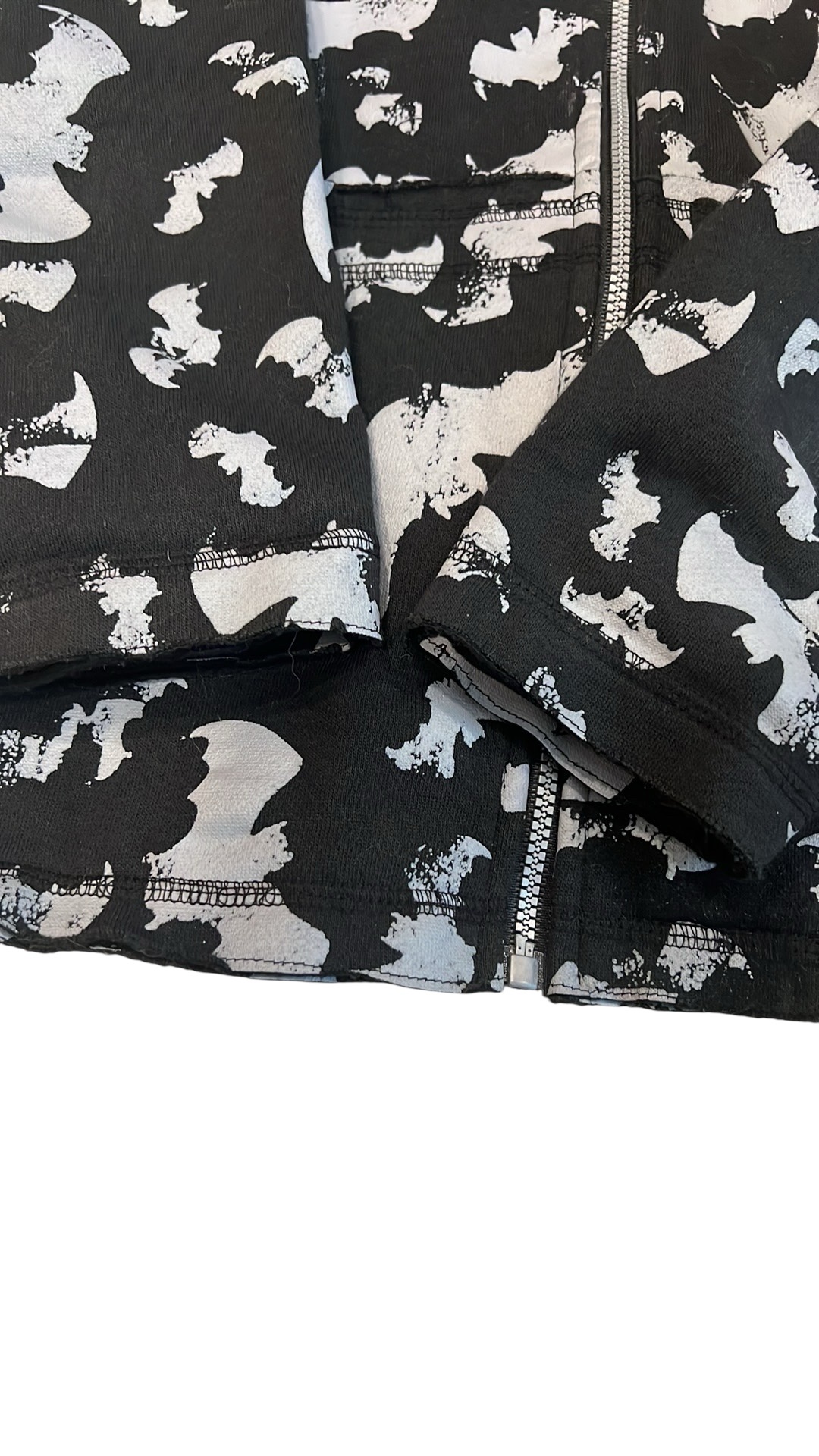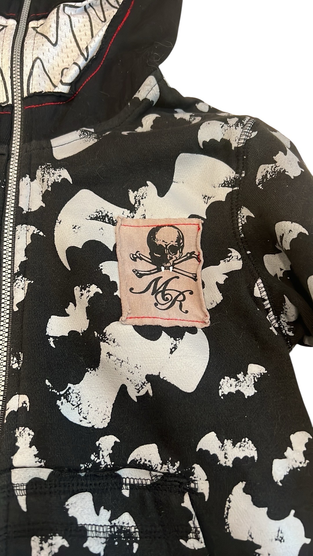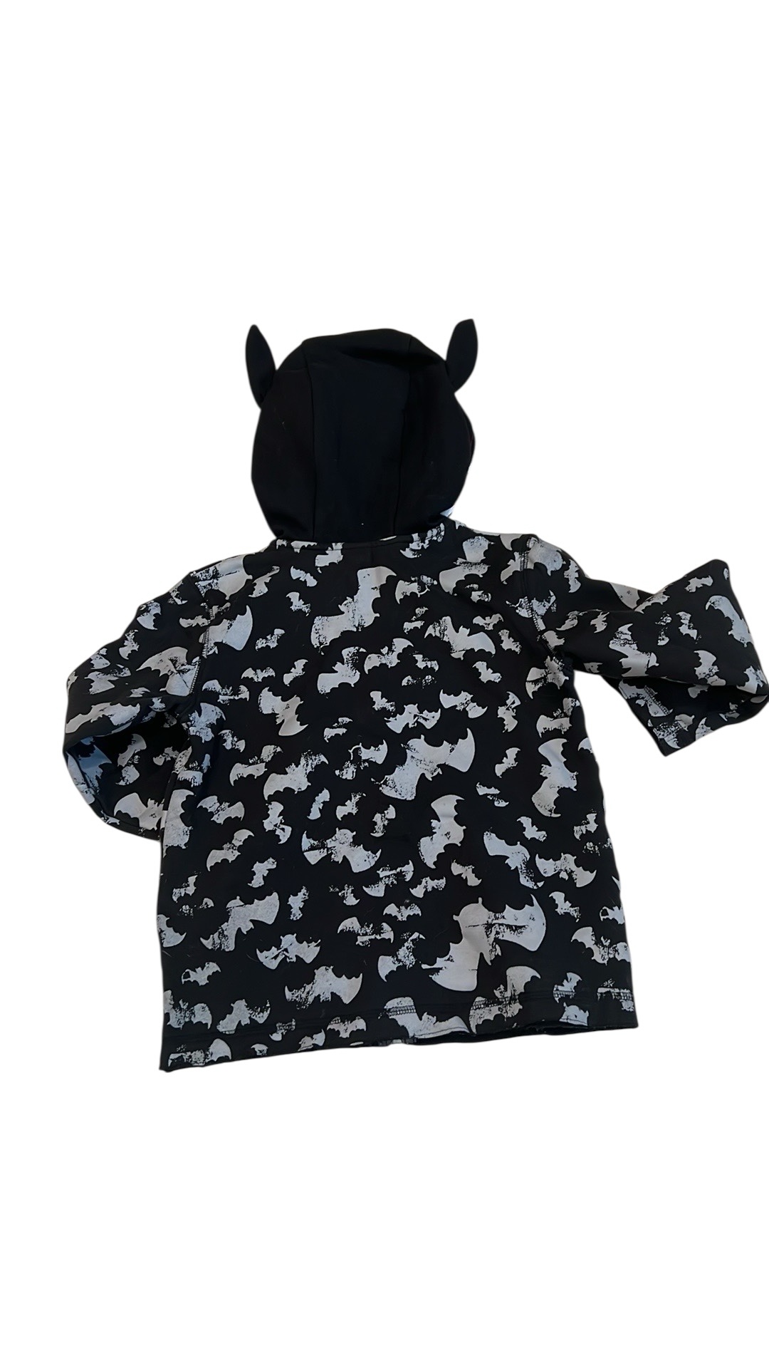 Like new, full zip hoodie. Black with grey bats. Zips all the way up to cover face, creating bat hoodie/mask, breathable mesh over mouth. Pockets. Monster Republic. Size 5