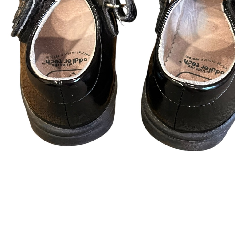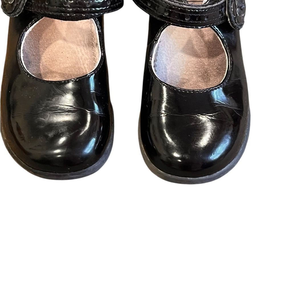Chic black patent Mary Janes with floral strap detail. Ideal for dressy occasions